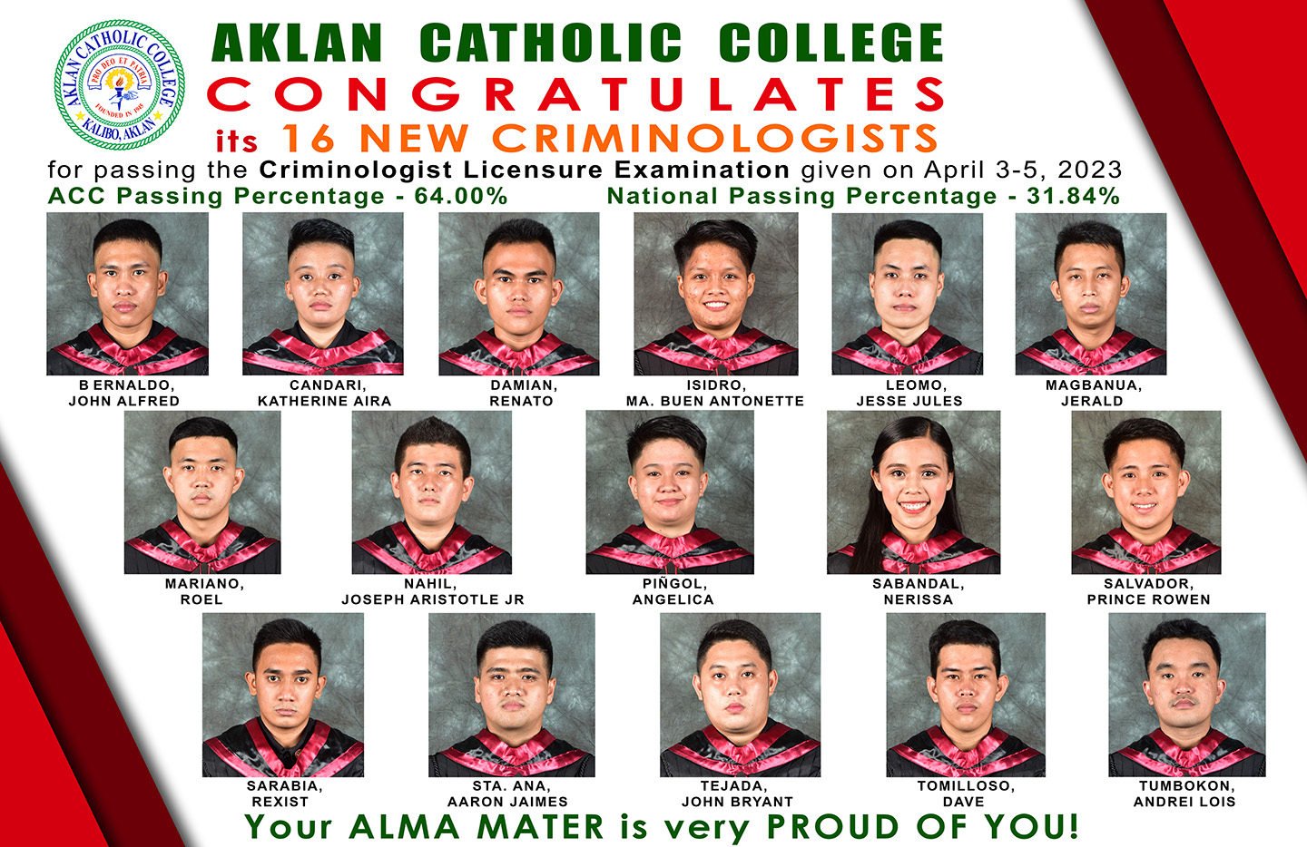 Congratulations to the 16 graduates of Aklan Catholic College (ACC) who conquered the April 2023 Licensure Examination for Criminologists! Your hard work, dedication, and perseverance have paid off. We are proud of your achievement and wish you all the best in your future endeavors.